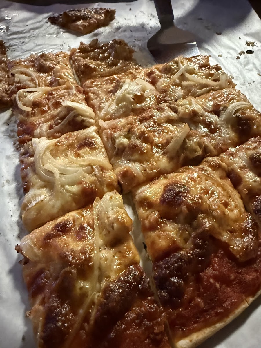 Thursday night is half off 18" cheese pizza and full price for each topping. Thin, crisp crust. Picture shows their regular bake. I would rate an 8.2.